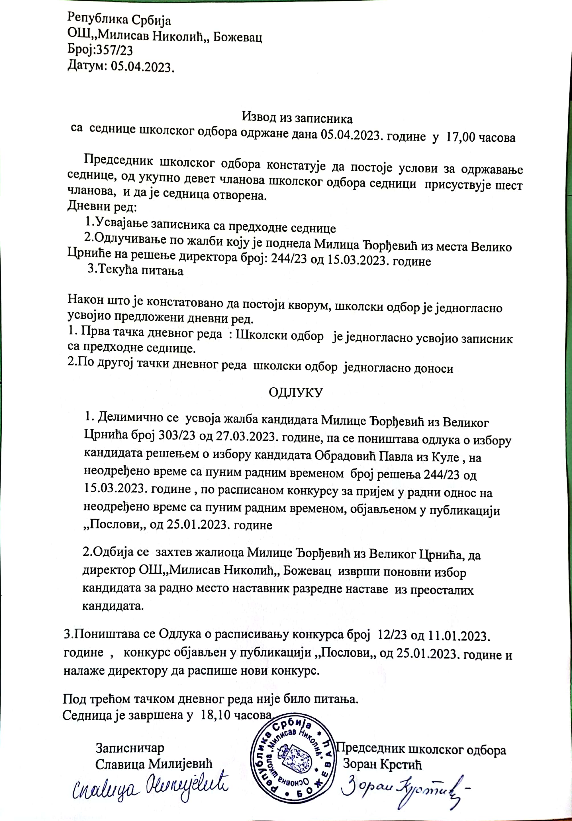 Одлука и позивРепублика Србија ОШ,,Милисав Николић,, Божевац Број: 307/23 Датум: 29.03.2023. године На основу чл.16. Пословника о раду школског одбора ОШ,,Милисав Николић,, Божевац доноси се ОДЛУКА Сазвати седницу Школског одбора ОШ,,Милисав Николић,, Божевац дана 5.4.2023. године са почетком у 17,00 часова. Одлуку објавитина огласној табли школе и интернет страници. Председник Школског одбора Зоран Крстић Република Србија ОШ,,Милисав Николић,, Божевац Број: 319/23 Датум: 31.03.2023. године ПОЗИВ Дана 05.04.2023. године са почетком у 17,00 часова одржаће се седница Школског одбора ОШ,,Милисав Николић,, Божевац . За седницу је предложен следећи: Дневни ред: